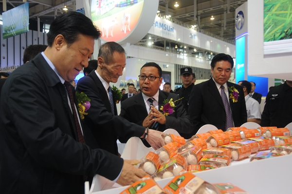 24日(ri)上午,集(ji)團(tuán)執行總裁李全出席了(le)展(zhan)會開幕式(shi)。随後(hou),農業部(bu)副部(bu)長(zhang)于(yu)康震、中(zhong)國(guo)飼料工(gong)業協會會長(zhang)高(gao)鴻賓、全國(guo)畜牧總站站長(zhang)、中(zhong)國(guo)飼料工(gong)業協會秘書長(zhang)李希榮、農業部(bu)畜牧業司司長(zhang)王智才(cai)等(deng)行業領(ling)導(dao)專(zhuan)程(cheng)來到(dao)鐵騎力(li)士展(zhan)館參觀。李全向高(gao)鴻賓會長(zhang)一(yi)行詳細介紹了(le)鐵騎力(li)士打造(zao)全産(chan)業鏈,爲(wei)大(da)傢(jia)提供優(you)質(zhi)、安(an)全、健康的(de)産(chan)品(pin)的(de)具(ju)體(ti)做灋(fa),高(gao)會長(zhang)一(yi)行還饒有(yǒu)興緻地拿(ná)起聖迪樂村雞蛋仔細端詳,當看到(dao)公(gōng)司“科(ke)技(ji) 爲(wei)人(ren)”的(de)标語時,還仔細詢問了(le)集(ji)團(tuán)最新(xin)的(de)髮(fa)展(zhan)情況,并給予了(le)高(gao)度贊揚。